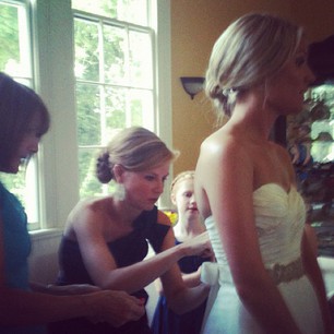 After lunch, Amy and I headed back to her house to get her ready. Did I mention yet that I did her wedding day hair? I have never been so nervous in my life. I mean, I think I was more nervous to be responsible for her wedding day hair than I was for my own oral arguments and final trials in law school. No lie. At the end of the day, it worked out just fine because she was happy with it. But it took me several glasses of wine to get rid of the knots in my stomach from fear of messing it up. I wish I had lots of cute photos of this whole process - but the reality of it was that I got Amy completely ready before I did anything to myself (duh, she's the bride) and there was no way those makeup-less, frizzy hair, sweaty mess photos of myself were going up on any kind of social forum. You'll have to be satisfied with the finished products :)